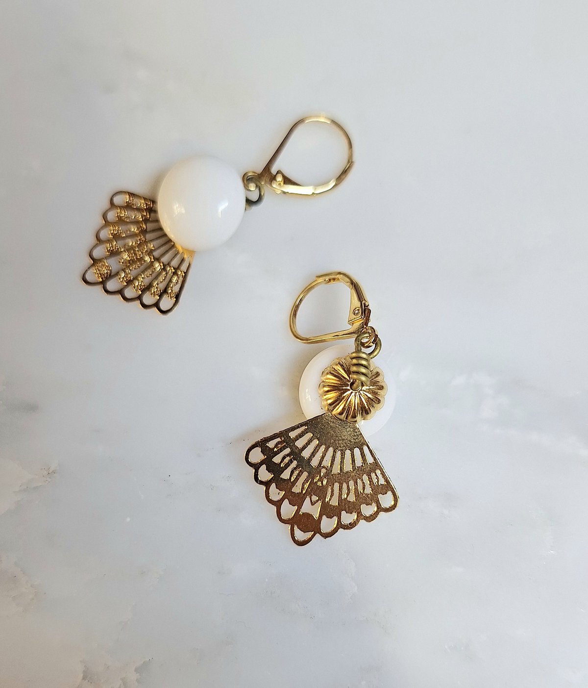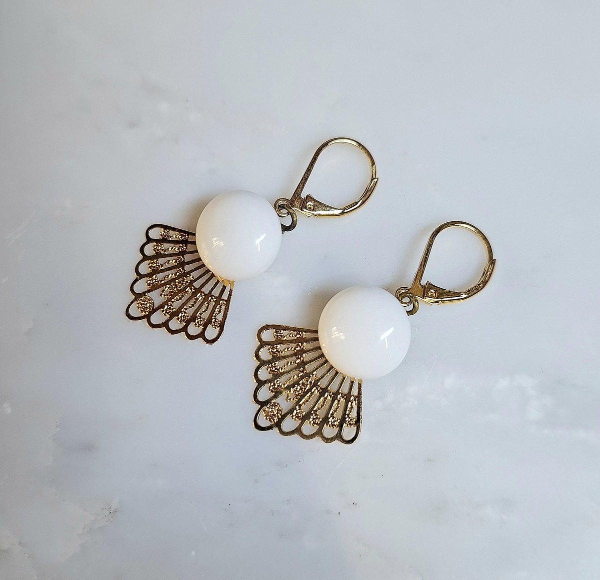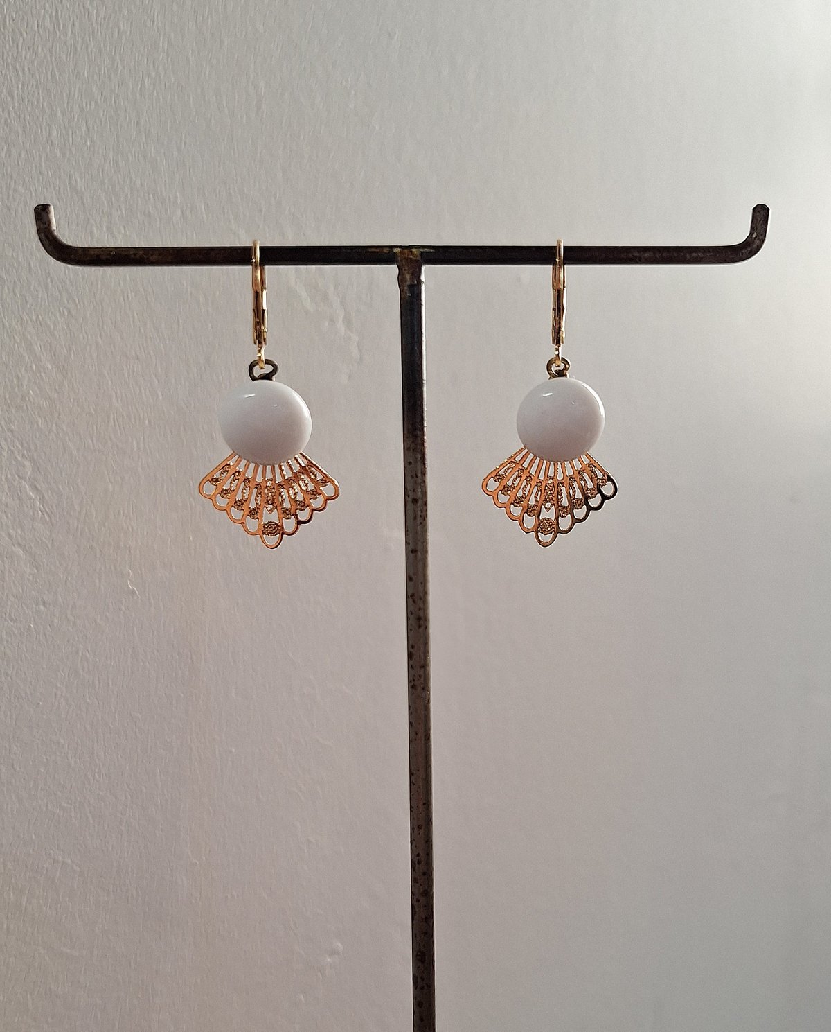 Perles anciennes rondes en verre blanc sur estampes ciselées / Longueur : 4 cm.